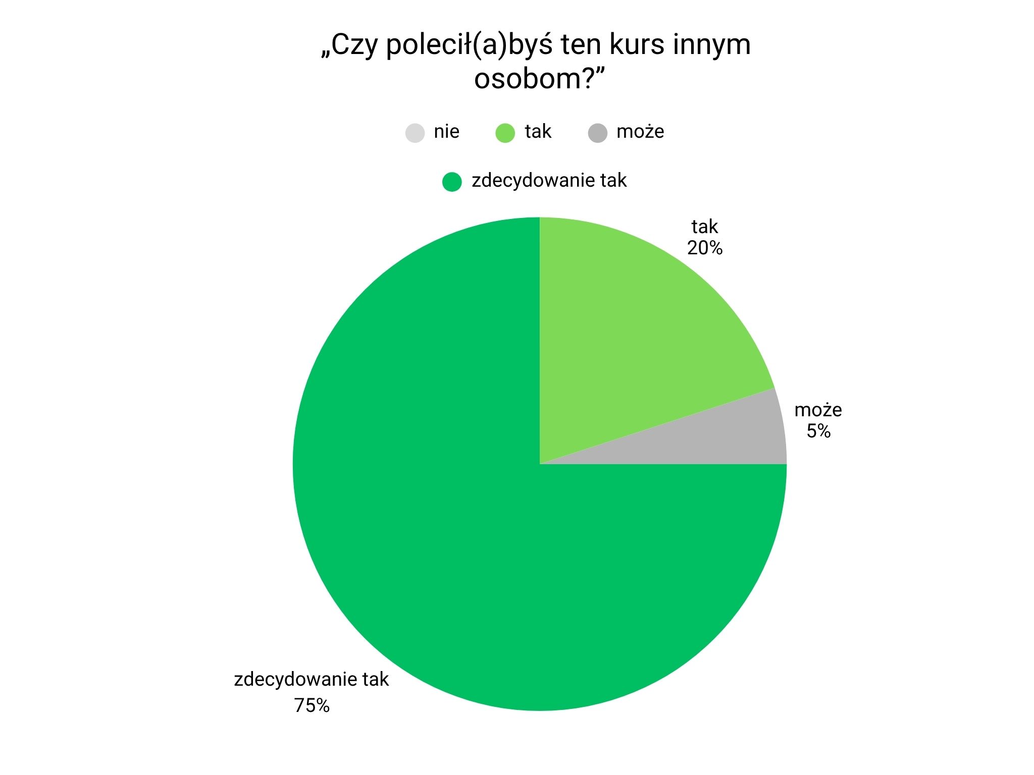 Tak odpowiadają absolwenci kursu w ankiecie końcowej na pytanie „Czy polecił(a)byś ten kurs innym osobom?”. Niesamowity wynik. Zdecydowanie tak 75%, tak 20%, może 5%, nie 0%.