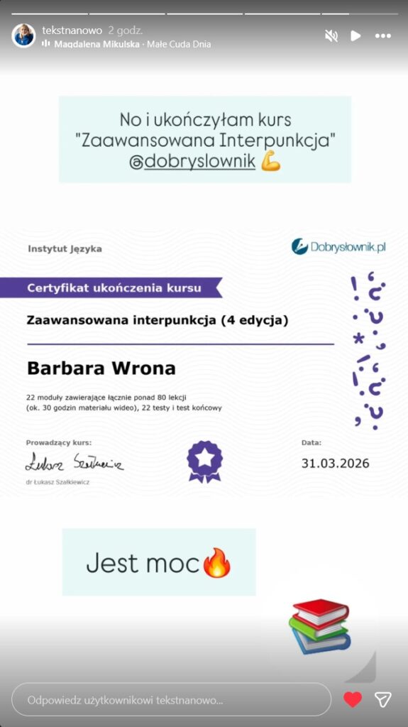 Bardzo mało jest źródeł, z których można dowiedzieć się czegoś bardziej zaawansowanego, jeśli chodzi o interpunkcję. Ten kurs był miodem na moje zbolałe korektorskie serce.